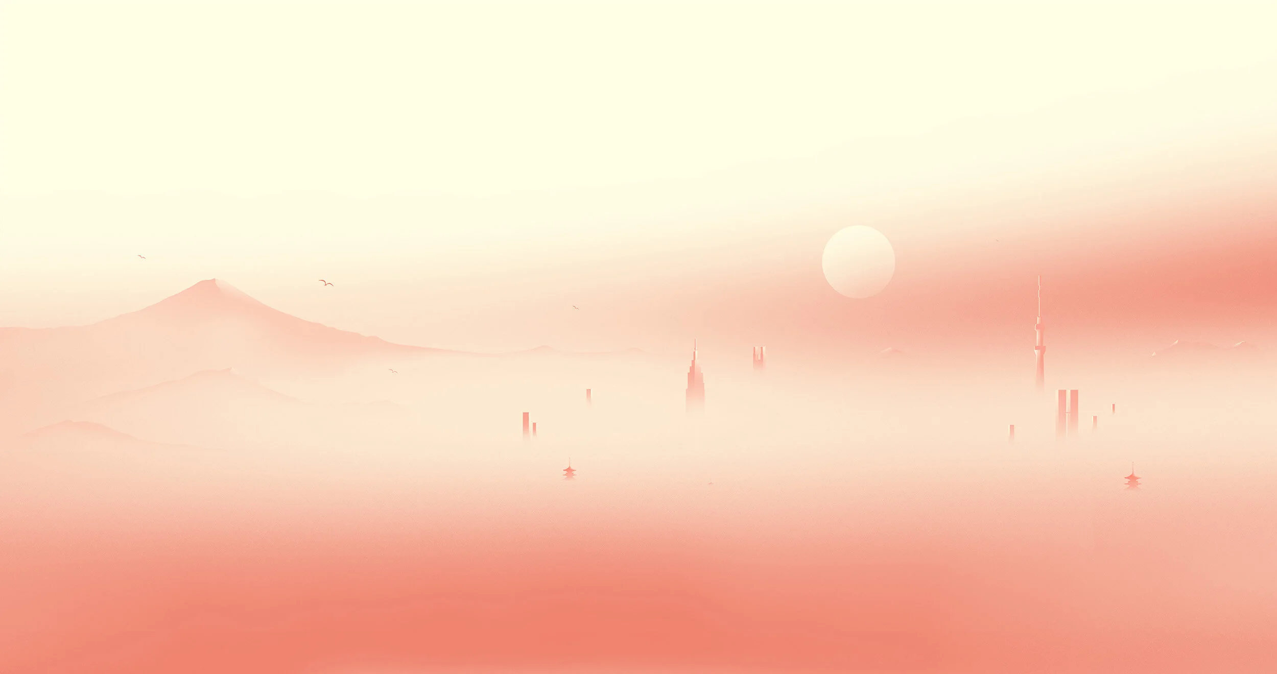 A minimalist digital painting of a city skyline with a mountain in the background, hazy atmosphere, and a pastel-colored sky with a large sun or moon.